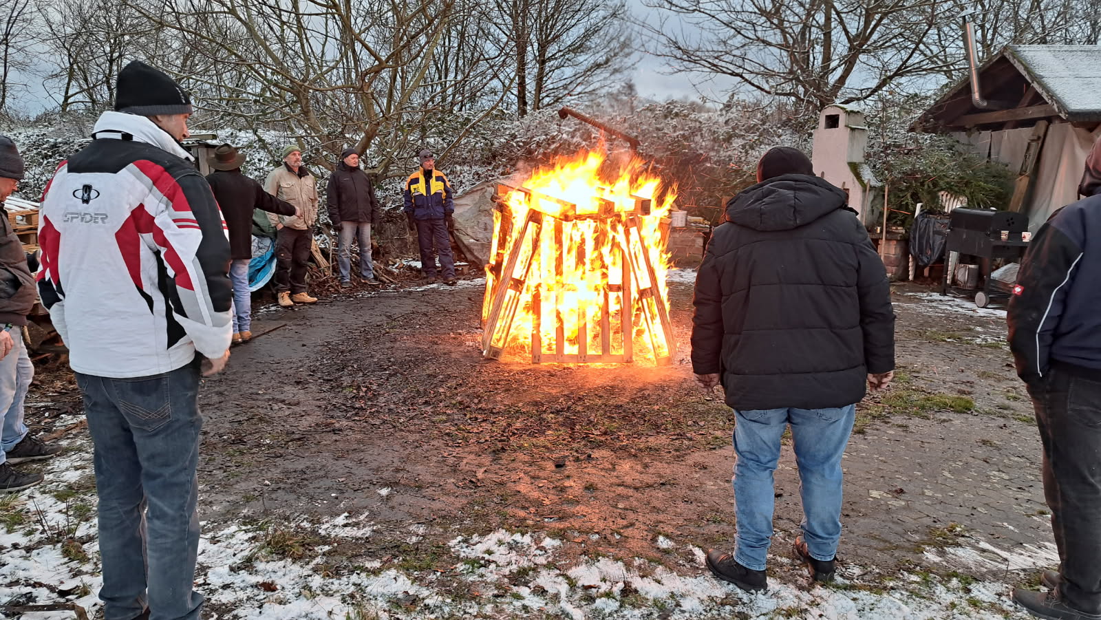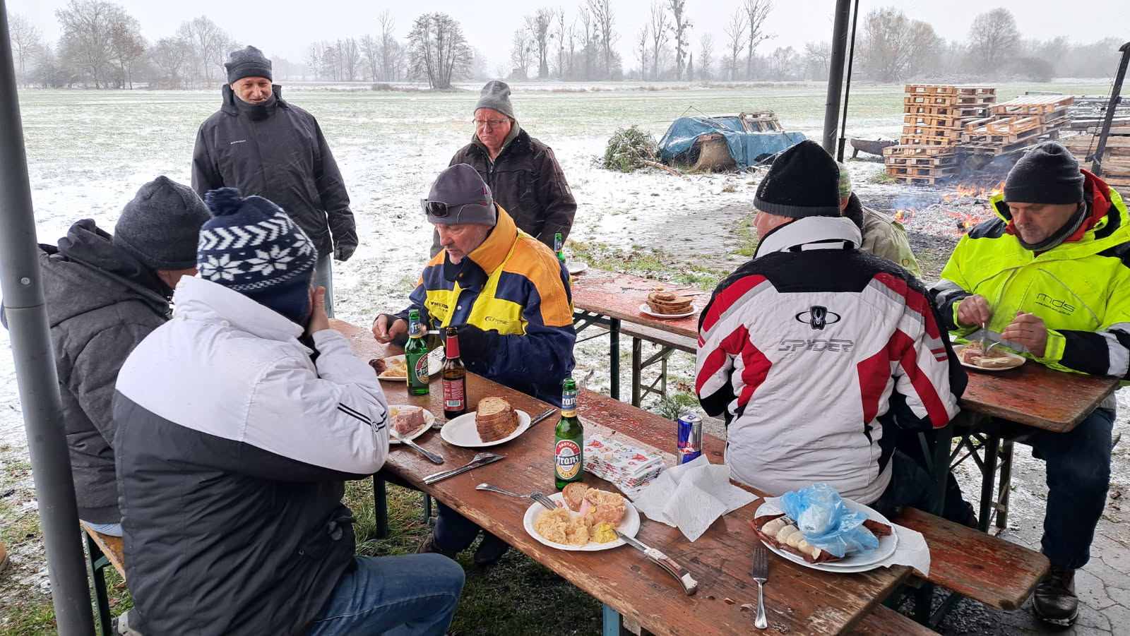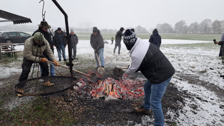 Auch Petrus hatte ein Einsehen mit und so konnten wieder knapp 40 Fliegerkameradinnen und -kameraden bei winterlichem Wetter – sogar ein schöner Schneeschauer war dabei – das Neujahrs-Fleischbraten genießen.